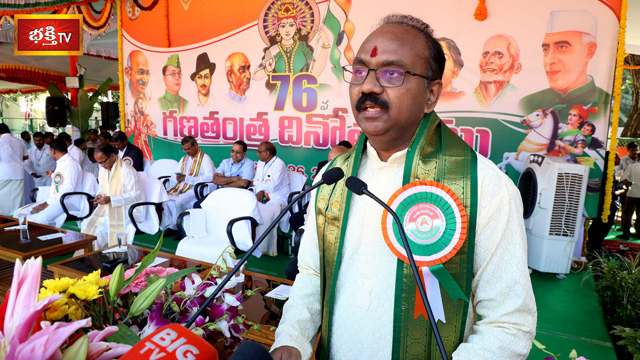 భారతదేశానికి స్వాతంత్య్రం తీసుకొచ్చేందుకు జాతీయ నాయకులు అకుంఠిత దీక్షతో ఎన్నో త్యాగాలు చేశారని, అలాంటి వారిని టీటీడీ ఉద్యోగులు స్ఫూర్తిగా తీసుకుని భక్తులకు మెరుగైన సేవలు అందించాలని టీటీడీ ఈవో శ్రీ జె.శ్యామలరావు అన్నారు. భారత 76వ గణతంత్ర దినోత్సవాన్ని తిరుపతిలోని టీటీడీ పరిపాలనా భవనంలో ఆదివారం ఘనంగా నిర్వహించారు. ఈ సందర్భంగా టీటీడీ ఈవో శ్రీ జె.శ్యామ‌ల‌రావు ప్రసంగించారు. వారి మాటల్లోనే…. ప్రపంచ ప్రఖ్యాత హైందవ ధార్మికసంస్థ అయిన తిరుమల తిరుపతి దేవస్థానంలో అత్యంత భక్తిశ్రద్ధలతో శ్రీపద్మావతీ వేంకటేశ్వరుల సేవలో తరిస్తున్న ధర్మకర్తల మండలికి, అధికార యంత్రాంగానికి, అర్చకులకు, సిబ్బందికి, శ్రీవారి సేవకులకు, స్కౌట్స్‌ అండ్‌ గైడ్స్‌కు, భక్తులకు ముందుగా 76వ గణతంత్ర దినోత్సవ శుభాకాంక్షలు.