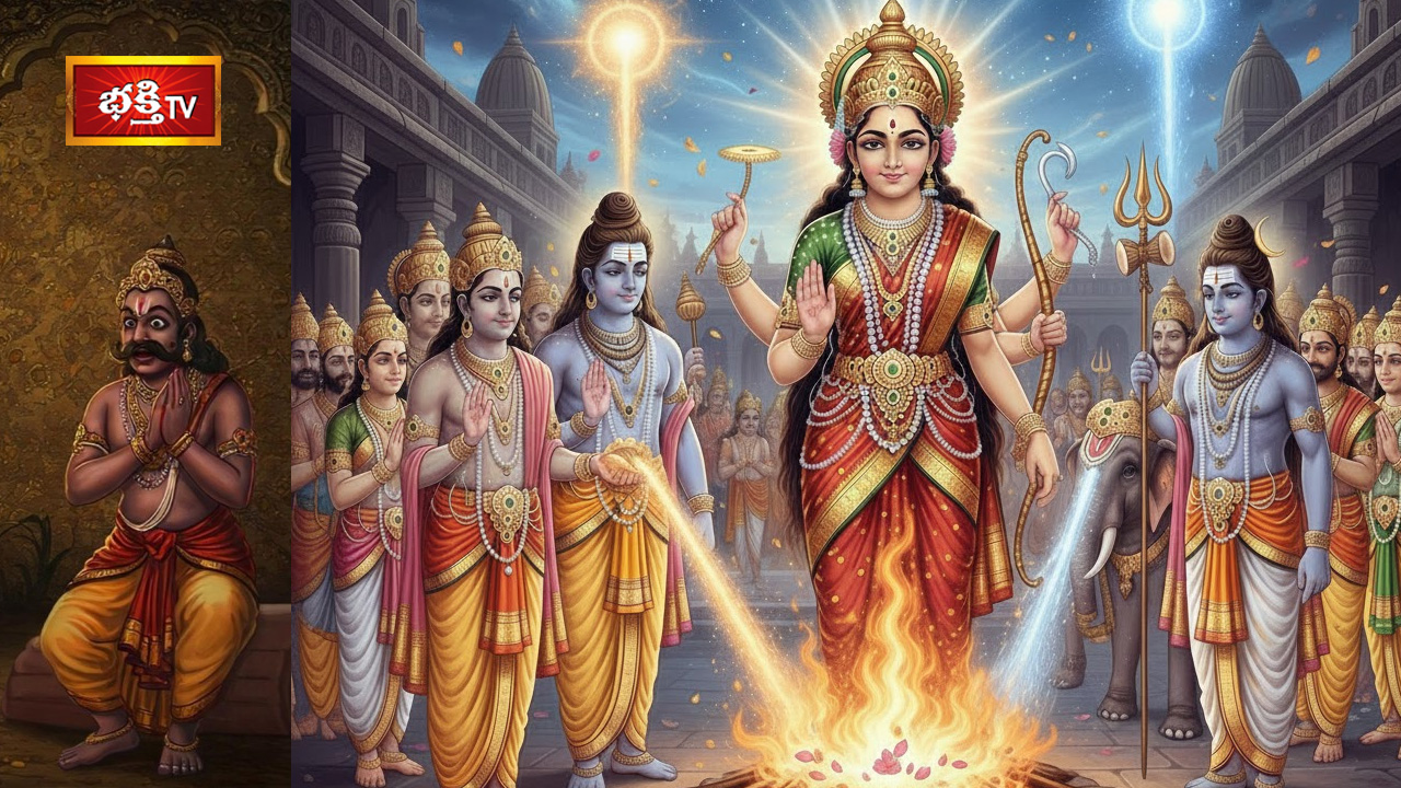 మొత్తానికి త్రిమూర్తులతో పాటు ఇంద్రుడు ఒక్కో శక్తిని సమర్పిస్తూ నిర్వహించిన యాగముతో జగన్మాత సంతోషించింది. ఆ యజ్ఞవేదిక నుంచి జగన్మాత పరాశక్తిగా ఆవిర్భవించిది. ఆ సమయంలో పరాశక్తి ఎలా ఉందో తెలుసుకుందాం. శిరస్సుపై రత్నకచితమైన స్వర్ణ కిరీటం ధరించి ఉంది. ఆ కిరీటం మీద అర్థచంద్రునితో అమ్మవారు ప్రకాశిస్తూ.. తన నాలుగు చేతుల్లో పాశం, అంకుశం, చెరుకు విల్లు, ఐదు పుష్పబాణాలు ధరించి ఉంది. ఆ జగన్మాతను చూచి బ్రహ్మాది దేవతలు సంతోషంతో అనేక స్తోత్రాలు చేశారు. దేవతల భక్తి భావానికి జగన్మాత ముగ్ధురాలైంది. అంతేకాకుండా భండాసురుని సంహరించి దేవతలను కాపాడుతానని అభయమిచ్చింది. ఆ తరువాత ఏం జరిగిందో మరో కథనంలో తెలుసుకుందాం.