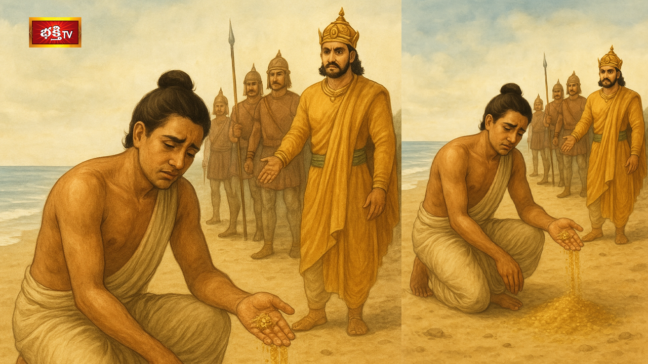 తండ్రికి చేయవలసిన ఖర్మలన్నీచేశాడు. చేతిలో చిల్లి గవ్వ లేదు. విచారంతో సముద్ర తీరం చేరి ఆలోచిస్తూ కూర్చున్నాడు. ఊరికే కూర్చోక చేతితో దోసిలి నిండా ఇసుకను తీసుకొని కిందకు పోస్తున్నాడు. ఒకసారి పోసాడు. రెండో సారి పోసేటప్పుడు తండ్రి ఆశీర్వాదము గుర్తుకొచ్చింది. “పట్టిందల్లా బంగారం అవుతుంది” ఈ ఇసుక బంగారం అయితే ఎంత బాగుంటుంది అని ఇసుకను కిందికి పోసి చూసాడు. మూడో సారి ఇసుకను చేతిలోనికి తీసుకొని తలపకెత్తగానే చుట్టూ సైనికులు తమ ఆయుధాలు గురి పెట్టి నిల్చొని వున్నారు. పక్కన రాజు గారు వున్నారు. ఆయన తీవ్రంగా ఏం చేస్తున్నావు? ఏం వెతుకు తున్నావని అడిగారు. దానికి తండ్రి మరణం, తన దుస్థితిని వివరించాడు. అప్పుడు సైనికులు దూరంగా వెళ్లిపోయారు.