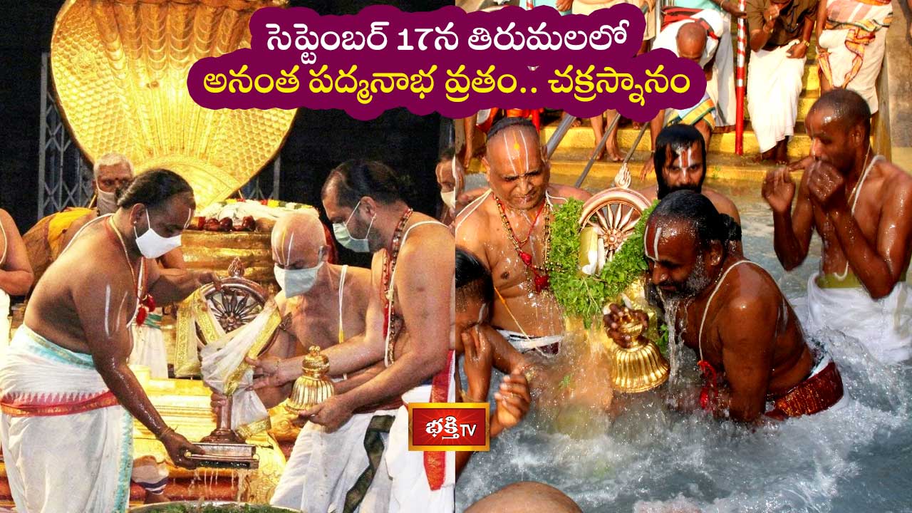 తిరుమలలో సెప్టెంబరు 17వ తేదీన అనంత పద్మనాభ వ్రతాన్ని టీటీడీ ఘనంగా నిర్వహించనుంది. ఈ సందర్భంగా ఉదయం 6 గంటలకు శ్రీవారి సుదర్శన చక్రత్తాళ్వారును ఆలయం నుండి ఊరేగింపుగా శ్రీభూవరాహస్వామి ఆలయం పక్కనున్న స్వామివారి పుష్కరిణి చెంతకు అర్చకులు ఆగమోక్తంగా తీసుకువెళ్లి పూజాది కార్యక్రమాలు నిర్వహిస్తారు. శ్రీవారి సుదర్శన చక్రత్తాళ్వార్లకు స్వామి పుష్కరిణిలో అభిషేకాదులు నిర్వహించి తిరిగి ఆలయానికి వేంచేపు చేస్తారు. కాగా అనంతుడు అనగా ఆదిశేషుడు. ఆదిశేషుడుపై అనంతపద్మనాభస్వామివారి అవతారంలో ఉన్న శ్రీమహావిష్ణువును ప్రార్థిస్తూ గృహస్థులు సౌభాగ్యంకోసం ఈ వ్రతాన్ని ఆచరిస్తారు.