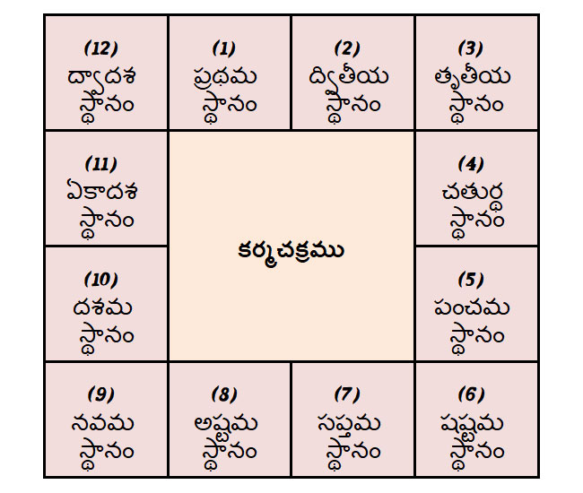 పై చక్రము బాగా అర్థమగుటకు కర్మచక్రమును కూడా చతురస్రా కారములో గీచి చూచుకోవచ్చును. కాలచక్రమునకు పేర్లు గలవు, కానీ కర్మచక్రమునకు పేర్లుండవు. కర్మచక్రములోని భాగములను అంకెలతోనే గుర్తుంచుకోవాలి. ఇందులోని మొదటి భాగమును ప్రథమ స్థానము అంటాము. మిగతా భాగములను వరుసగా రెండవ భాగమును ద్వితీయ స్థానము, మూడవ భాగమును తృతీయస్థానము, నాల్గవ భాగమును చతుర్థస్థానము, ఐదవ భాగమును పంచమస్థానము, ఆరవభాగమును షష్టమస్థానము, ఏడవ భాగమును సప్తమస్థానము, ఎనిమిదవ భాగమును అష్టమస్థానము, తొమ్మిదవ భాగమును నవమస్థానము, పదవభాగమును దశమస్థానము, పదకొండవ భాగమును ఏకాదశస్థానము, పండ్రెండవ భాగమును ద్వాదశస్థానము అని అంటున్నాము. కర్మచక్రమునూ, దాని భాగములనూ చతురస్రాకారములో చూపుతూ, అందులో కర్మ భాగములను కూడా చూపు చిత్రమును క్రిందగల 5వ పటమునందు చూడండి.