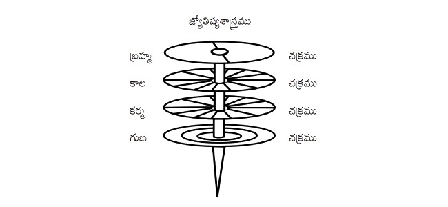 ఈ పండ్రెండు కాలచక్రభాగములలోనున్న గ్రహములు నిర్ణీతమైన వేగముతో గతి తప్పక ప్రయాణించుచూ తమ కిరణములను కర్మచక్రము మీద ప్రసరింపజేస్తుంది. ఇపుడు చక్రముల వివరము పూర్తిగా తెలుసుకొందాము. ప్రతి మనిషి తలలో బ్రహ్మ,కాల, కర్మ, గుణచక్రములను నాలుగు చక్రముల సముదాయము గలదు. ఈ నాలుగు చక్రముల సముదాయము విశ్వములోని జీవులందరికీ ఆధారమైయున్నది. ఈ నాల్గుచక్రముల సముదాయము తెలియకపోతే మనిషికి దైవజ్ఞానము ఏమాత్రము తెలియదని చెప్పవచ్చును. నాల్గు చక్రములు అటు బ్రహ్మవిద్య లోనూ (ఆధ్యాత్మిక విద్యలోనూ), ఇటు జ్యోతిష్యశాస్త్రములోనూ ప్రాధాన్యత కల్గియున్నవి. ఈ నాల్గుచక్రముల వివరము కూలంకషముగా తెలియాలంటే త్రైతసిద్ధాంత భగవద్గీతలోని, అక్షర పరబ్రహ్మయోగమను అధ్యాయమును చదవండి. అక్కడే మన శరీరములోని నాల్గుచక్రముల వివరము తెలియగలదు. ఈ నాల్గుచక్రముల వివరము తెలియకపోయిన దానివలన, ఇటు బ్రహ్మవిద్యాశాస్త్రమైన ఆధ్యాత్మికములోనూ, అటు కర్మ విధానమైన జ్యోతిష్యరంగములోనూ మనుషులు వెనుకబడిపోయి యున్నారు. నాల్గు చక్రములంటే ఏమిటి? అవి ఎక్కడున్నవి? అని తెలియనంత వరకు సంపూర్ణమైన దైవ జ్ఞానమునుగానీ, సంపూర్ణమైన జ్యోతిష్యమునుగానీ తెలియలేము. కళ్ళు లేనివానికి దృష్టి ఏమాత్రములేనట్లు, బ్రహ్మ, కాల, కర్మ, గుణచక్రముల వివరము తెలియని వానికి జ్ఞానదృష్టి ఏమాత్రముండదు. ప్రతి శరీరములో నుదుటి భాగమున లోపల గల నాల్గు చక్రముల సముదాయమును తర్వాత పేజీలోని 2వ చిత్రపటమునందు చూడండి.