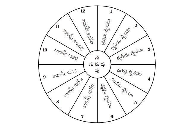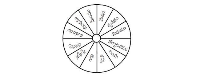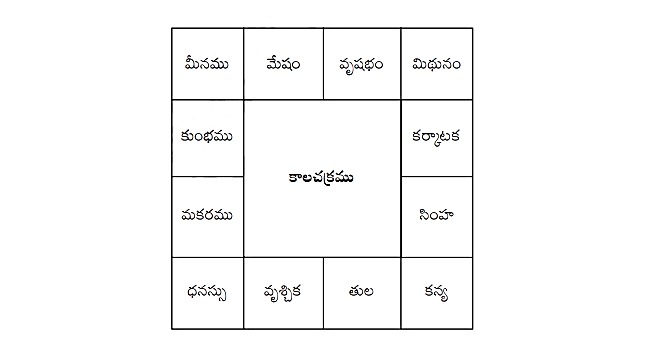 1) మేషము 2) వృషభము 3) మిథునము 4) కర్కాటకము 5) సింహము 6) కన్య 7) తుల 8) వృశ్చికము 9) ధనస్సు 10) మకరము 11) కుంభము 12) మీనము.
